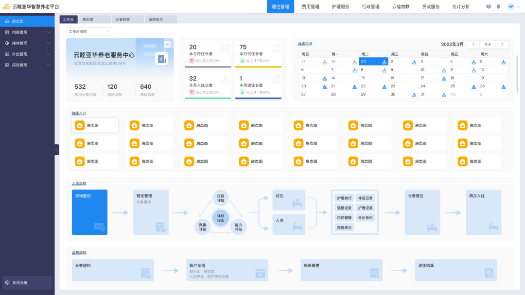 智慧養(yǎng)老管理平臺是側重于養(yǎng)老機構的專業(yè)運營管理平臺,主要包括:入住管理、收費管理、檔案管理、護理管理、接待管理、庫存管理、呼叫記錄管理、評估管理、人事管理、資產(chǎn)管理等管理功能,以及各類對入院老人身體狀況監(jiān)測、體征數(shù)據(jù)監(jiān)測、緊急呼救、室內定位設備的集成與應用。