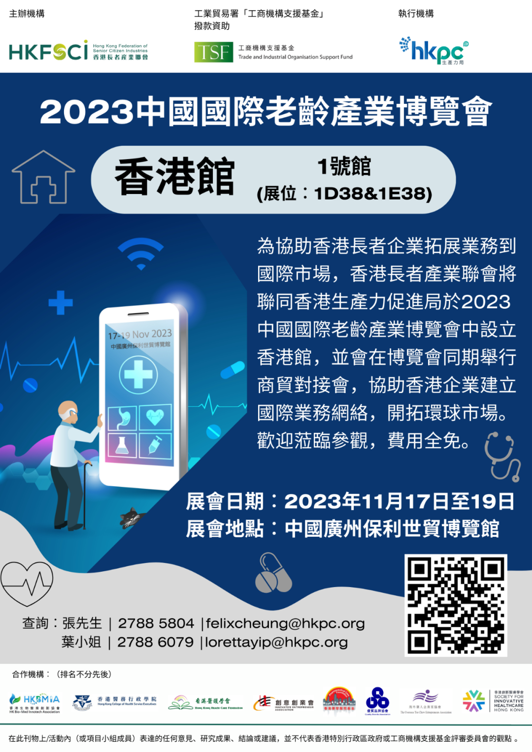 中國國際老齡產(chǎn)業(yè)博覽會將于2023年11月17-19日在廣州保利世貿(mào)博覽館舉行,香港長者產(chǎn)業(yè)聯(lián)會聯(lián)同香港生產(chǎn)力促進局,成功取得香港特別行政區(qū)政府工業(yè)貿(mào)易署「工商機構支援基金」撥款資助,將組織20多家香港本土品牌養(yǎng)老企業(yè)組成展團,強勢參展(展位號:1D38 & 1E38),現(xiàn)場將呈現(xiàn)大灣區(qū)養(yǎng)老領域的創(chuàng)新成果和前沿技術,促進灣區(qū)跨境養(yǎng)老產(chǎn)業(yè)的交流合作,也為灣區(qū)跨境養(yǎng)老產(chǎn)業(yè)的發(fā)展注入了新的活力。