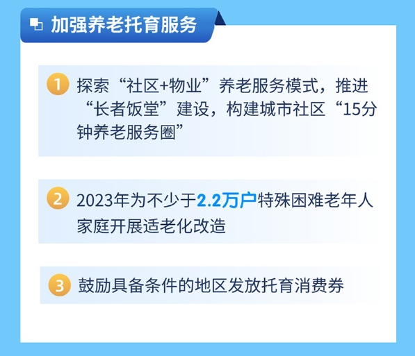 (十三)加強(qiáng)養(yǎng)老托育服務(wù)。建立健全居家社區(qū)養(yǎng)老服務(wù)網(wǎng)絡(luò),探索“社區(qū)+物業(yè)”養(yǎng)老服務(wù)模式,推進(jìn)“長者飯?zhí)?rdquo;建設(shè),構(gòu)建城市社區(qū)“15分鐘養(yǎng)老服務(wù)圈”。2023年為不少于2.2萬戶特殊困難老年人家庭開展適老化改造。加大福彩公益金對農(nóng)村養(yǎng)老服務(wù)設(shè)施建設(shè)的支持力度。深入開展智慧健康養(yǎng)老試點示范。積極探索“旅居養(yǎng)老”新業(yè)態(tài),加強(qiáng)旅居養(yǎng)老省際合作,強(qiáng)化粵港澳跨境養(yǎng)老服務(wù)合作,支持旅居養(yǎng)老示范基地建設(shè),打造高品質(zhì)旅居養(yǎng)老目的地。支持機(jī)關(guān)、學(xué)校、醫(yī)療機(jī)構(gòu)等單位及企業(yè)利用自有資金和場所為職工提供福利性托管托育服務(wù)。鼓勵具備條件的地區(qū)發(fā)放托育消費券。支持養(yǎng)老托育服務(wù)機(jī)構(gòu)依托職業(yè)院校共建產(chǎn)教融合實訓(xùn)基地,探索工學(xué)一體化培訓(xùn)模式,推動解決養(yǎng)老托育行業(yè)用工難問題。(各地級以上市人民政府,省民政廳、教育廳、發(fā)展改革委、衛(wèi)生健康委、人力資源社會保障廳、文化和旅游廳、工業(yè)和信息化廳按職責(zé)分工負(fù)責(zé))