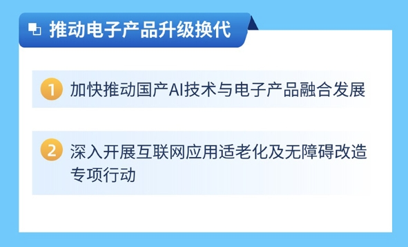 (六)推動電子產(chǎn)品升級換代。加快推動國產(chǎn)AI技術(shù)與電子產(chǎn)品融合發(fā)展,加快發(fā)展人機(jī)交互、場景感知、圖像識別、語音交互等技術(shù),支持企業(yè)圍繞智能家居、文化教育、醫(yī)療健康、交通旅游等領(lǐng)域開發(fā)新型終端產(chǎn)品,鼓勵企業(yè)打造電子產(chǎn)品消費新場景。加快推進(jìn)電子產(chǎn)品適老化改造。深入開展互聯(lián)網(wǎng)應(yīng)用適老化及無障礙改造專項行動,支持互聯(lián)網(wǎng)應(yīng)用開發(fā)粵語、客家話、潮汕話等語音搜索功能。(各地級以上市人民政府,省工業(yè)和信息化廳、民政廳按職責(zé)分工負(fù)責(zé))