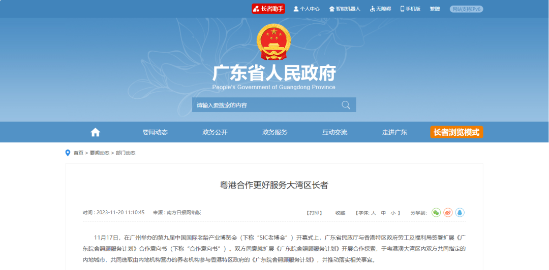 11月17日,在廣州舉辦的第九屆中國國際老齡產(chǎn)業(yè)博覽會(下稱“SIC老博會”)開幕式上,廣東省民政廳與香港特區(qū)政府勞工及福利局簽署擴展《廣東院舍照顧服務計劃》合作意向書(下稱“合作意向書”)。雙方同意就擴展《廣東院舍照顧服務計劃》開展合作探索,于粵港澳大灣區(qū)內(nèi)雙方共同指定的內(nèi)地城市,共同選取由內(nèi)地機構營辦的養(yǎng)老機構參與香港特區(qū)政府的《廣東院舍照顧服務計劃》,并推動落實相關事宜。