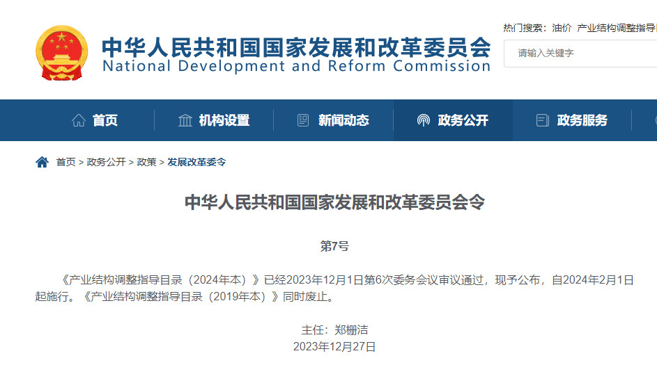 近日,國家發(fā)展改革委修訂發(fā)布了《產(chǎn)業(yè)結(jié)構(gòu)調(diào)整指導目錄(2024年本)》(以下簡稱為《目錄(2024年本)》),將于2024年2月1日起正式施行。