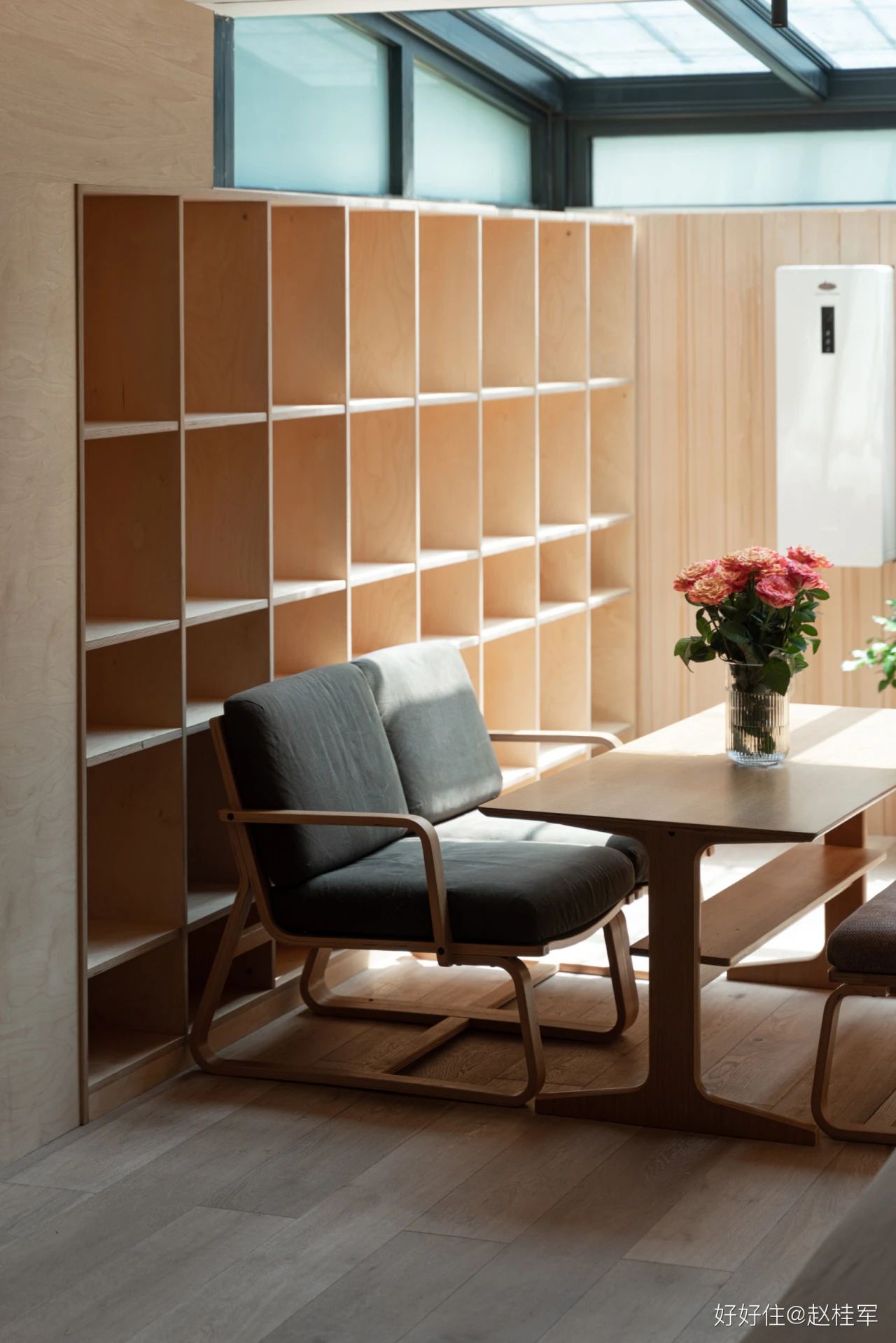 另一側(cè)則是做了開放式的收納格,可以收納一些書和小物。將陽臺重新利用后,這里不只是用餐區(qū),也是一個集閱讀、工作、家務(wù)、植物為一體的多功能空間。