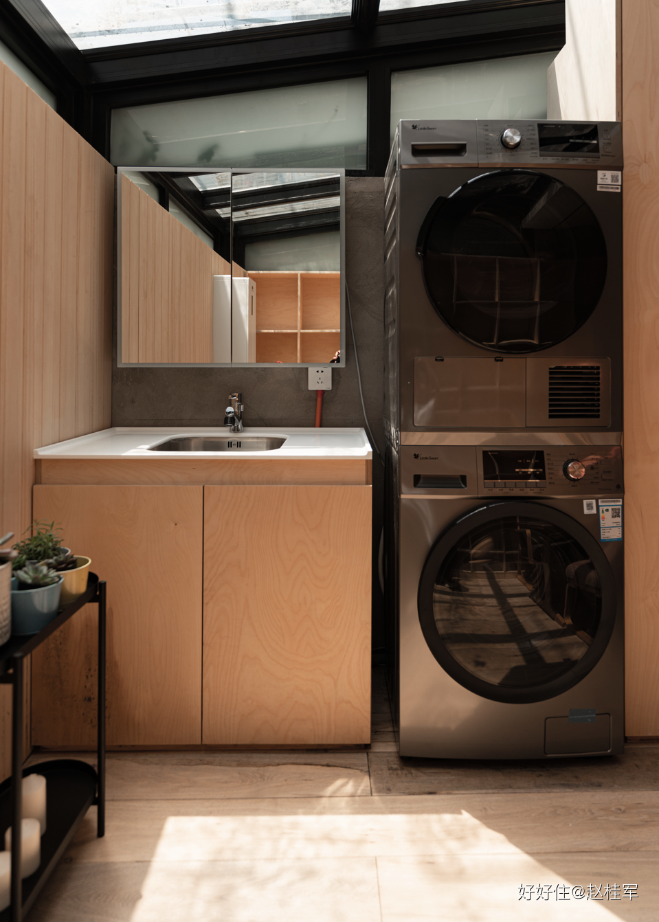 這里也有一個家務(wù)區(qū),除了洗烘套裝,還有一個洗手臺,滿足日常的家務(wù)需求。
