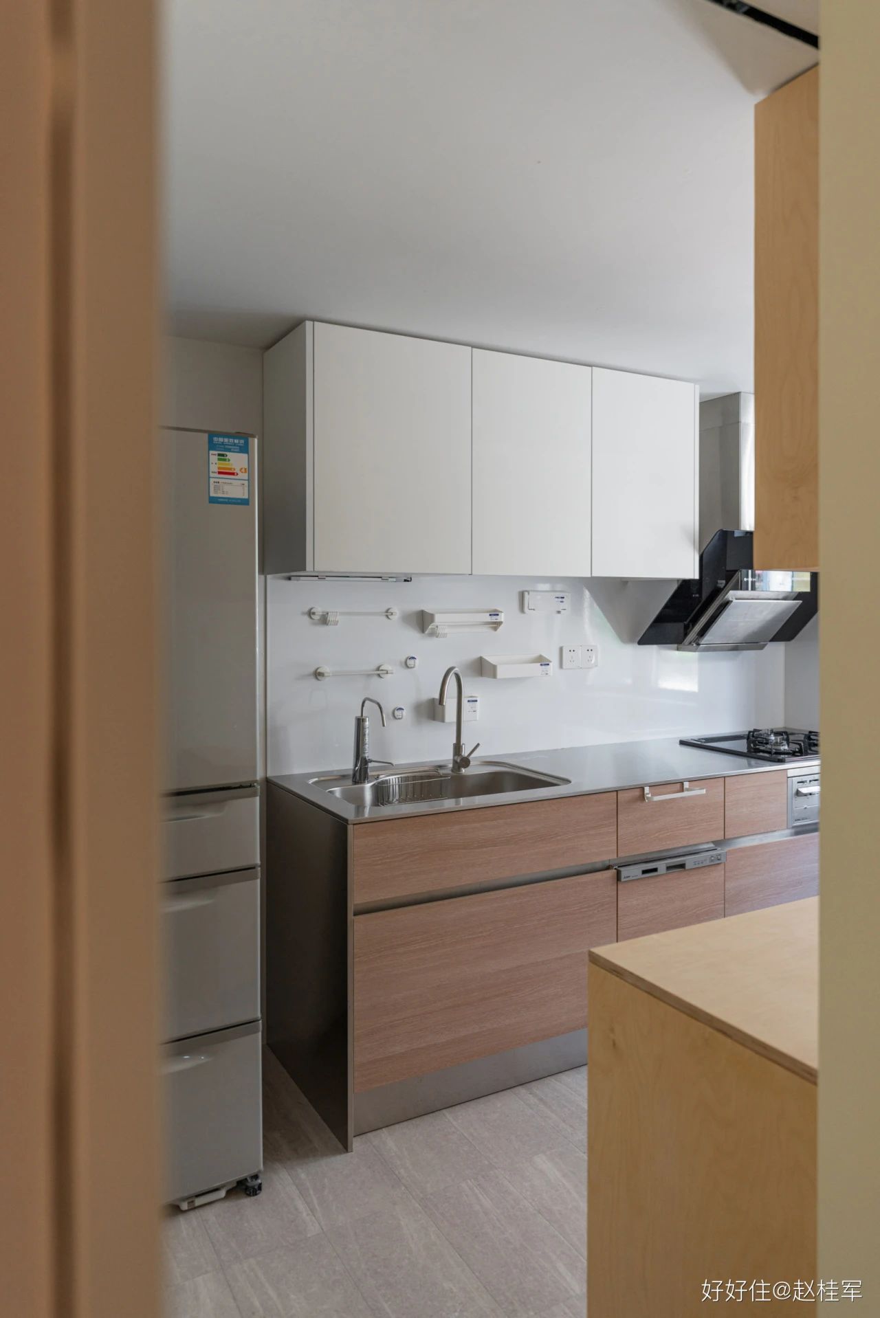 櫥柜是日本進口 sanwa 整體櫥柜,原木色+白色,再配上不銹鋼操作臺面,整個空間簡潔大方,便于清潔。