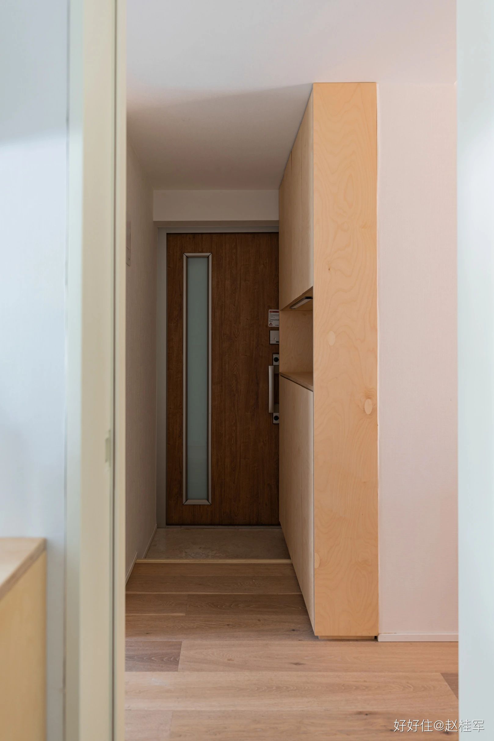 玄關(guān)地面和室內(nèi)地面形成的高度差,減少塵土帶入,讓室內(nèi)更干凈。進門右面墻面預(yù)制結(jié)構(gòu)板,以便后期加裝折疊凳。