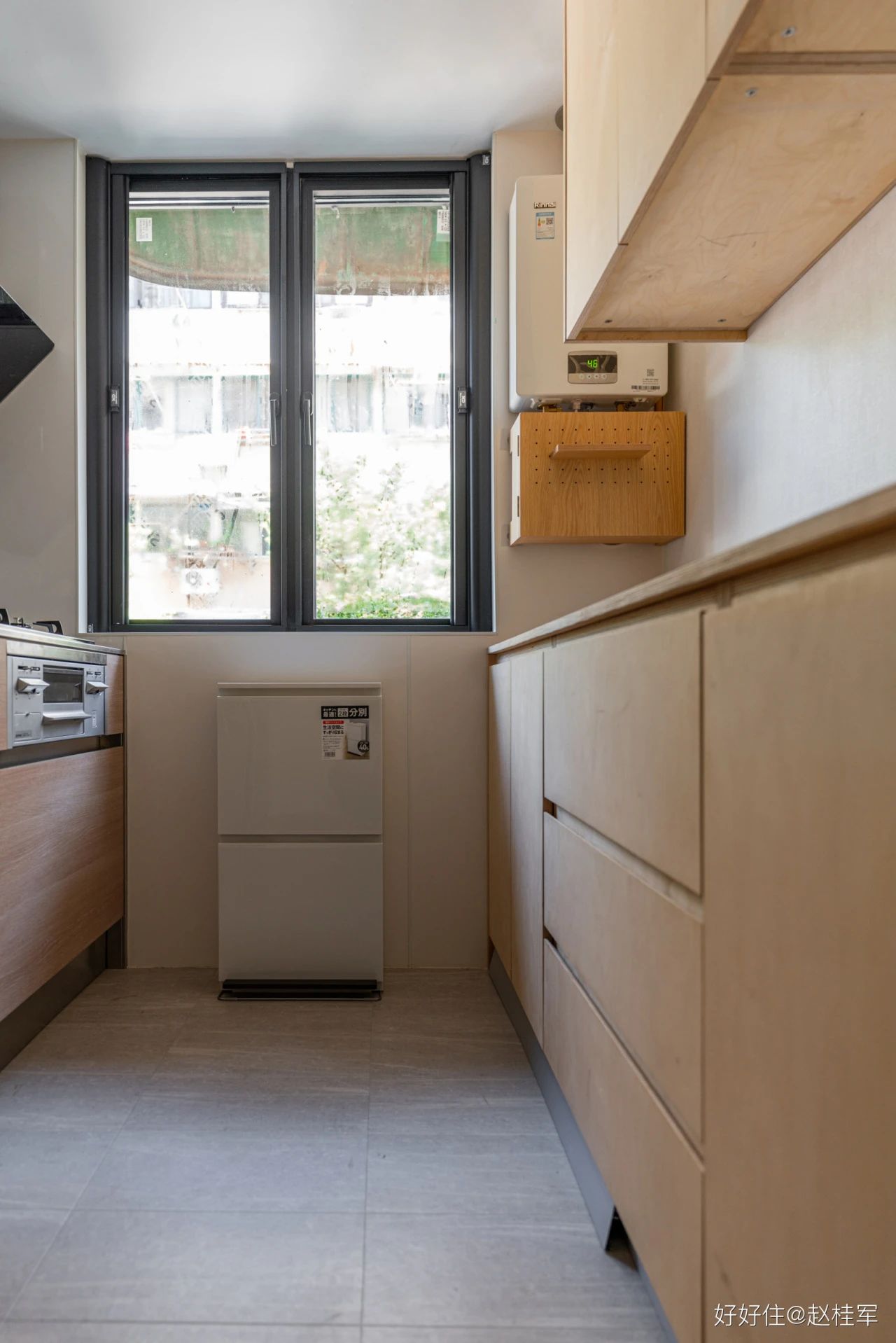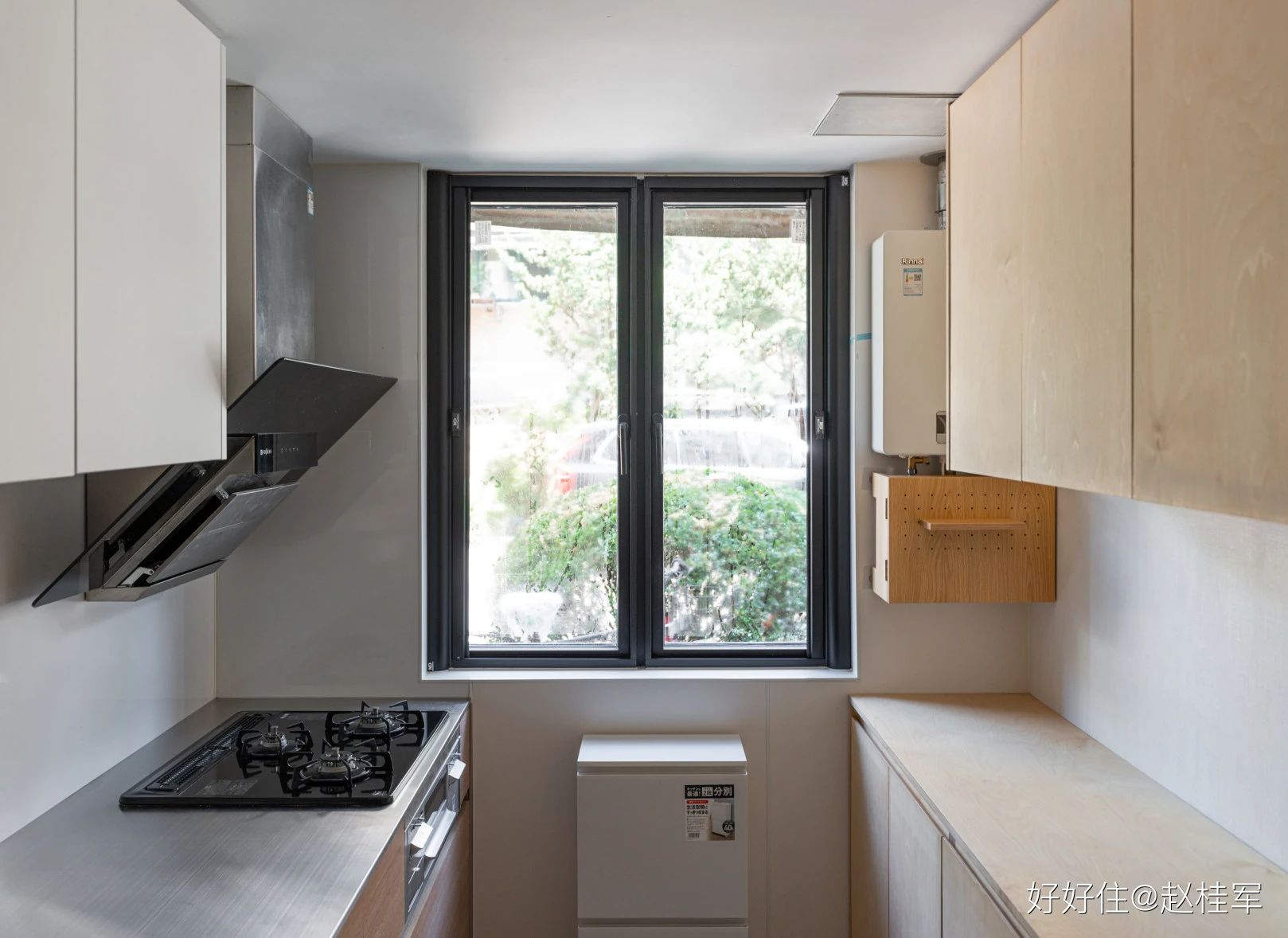 廚房整個操作動線直接了當,盡頭的一扇窗戶,給空間留足光照,讓廚房更顯通透。