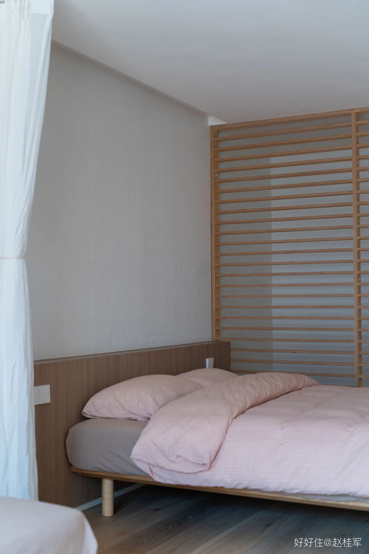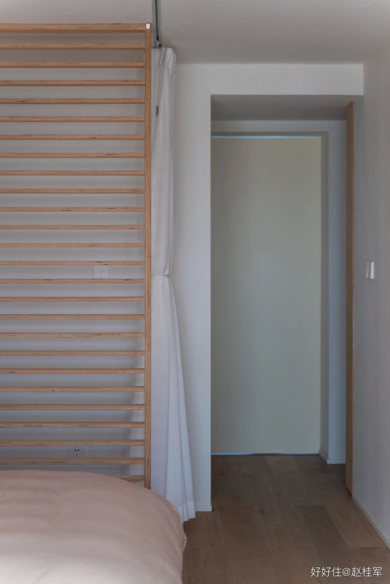 客廳與臥室之間,用軟性的簾子作為分隔,很溫柔。另一邊是木色的柵欄式隔斷,也很貼合媽媽的審美。