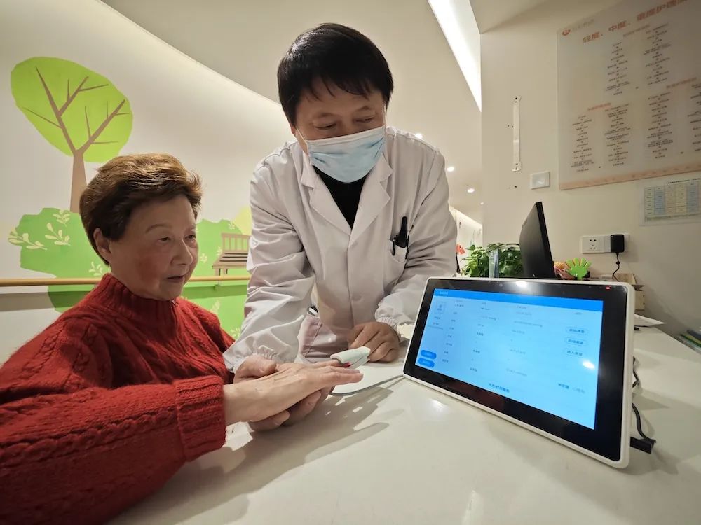 在服務(wù)臺,看到一套健康隨診包,醫(yī)生會定期對老人的身體狀況進(jìn)行體檢,包括體溫、血壓等體檢數(shù)據(jù)會自動上傳至系統(tǒng)建立老年人健康數(shù)據(jù)檔案,為長期的老年人健康管理提供數(shù)據(jù)支撐,也可以為醫(yī)生提供更加全面的病人信息,提高醫(yī)療診斷的準(zhǔn)確性和效率。