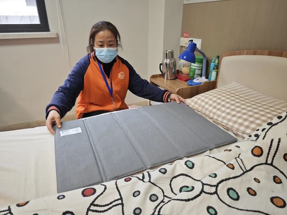 來到房間,每個床位上都安裝智能床墊,可實時監(jiān)測老年人的行動和睡眠情況,提高生活質(zhì)量;同時老人床上鋪著生命體征監(jiān)測床墊,夜間和老人休息時可實時傳送老人的心跳等健康情況。