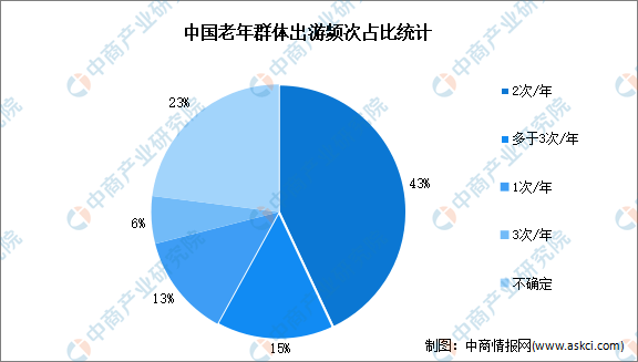 從老年人出游頻次來看,老年人退休后閑暇時間較多,出游頻次較高。2次/年占比最高達43%,其次,多于3次/年、1次/年占比分別為15%、13%。3次/年占比6%。