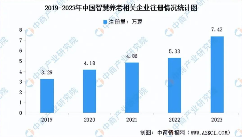 我國智慧養(yǎng)老企業(yè)數(shù)量眾多,根據(jù)企查查數(shù)量顯示,截至2023年底我國現(xiàn)存智慧養(yǎng)老企業(yè)總數(shù)達(dá)到39.90萬家。從智慧養(yǎng)老產(chǎn)業(yè)相關(guān)企業(yè)歷年注冊(cè)量來看,在巨大的養(yǎng)老需求下,企業(yè)注冊(cè)量呈逐年增長趨勢(shì),由2019年的3.29萬家增長至2023年的7.42萬家,復(fù)合年均增長率達(dá)22.55%。