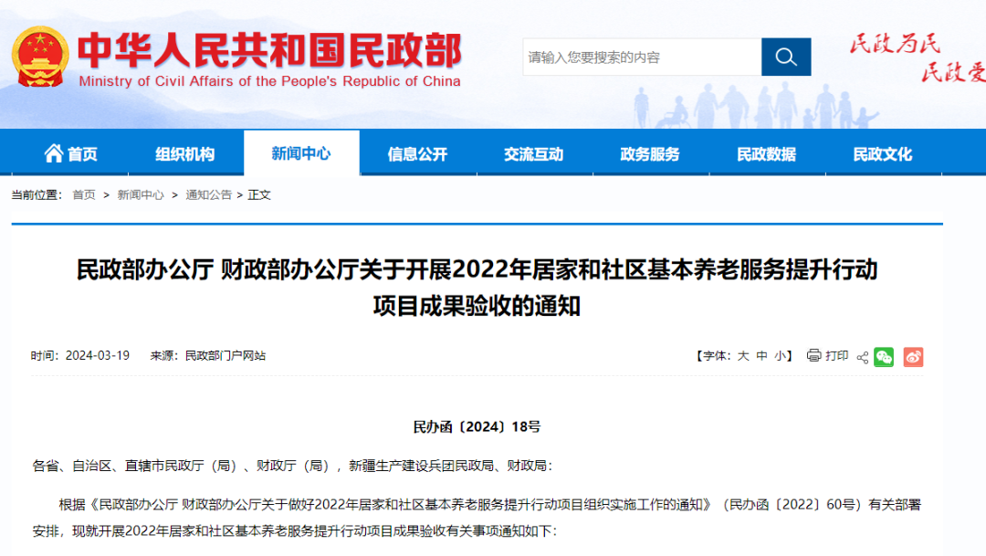 關(guān)注!民政部、財政部發(fā)布《關(guān)于開展2022年居家和社區(qū)基本養(yǎng)老服務(wù)提升行動項目成果驗收的通知》