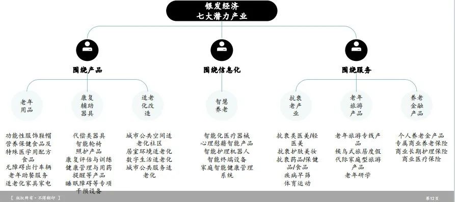 根據(jù)《國務(wù)院辦公廳關(guān)于發(fā)展銀發(fā)經(jīng)濟(jì)增進(jìn)老年人福祉的意見》,未來將聚焦產(chǎn)品、服務(wù)、信息化等方面的多樣化需求,培育以下七大潛力產(chǎn)業(yè)。