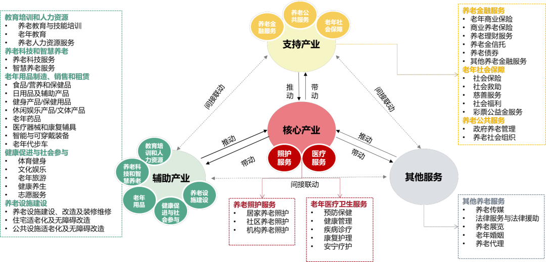 主要沿著養(yǎng)老服務(wù)供給體系,配置關(guān)鍵供給支撐要素,發(fā)育出包括面向老年群體的老年用品,以及面向老年群體與養(yǎng)老企業(yè)的教培、科技、智慧、適老化改建等領(lǐng)域,并可延伸至精神與社會參與服務(wù)。