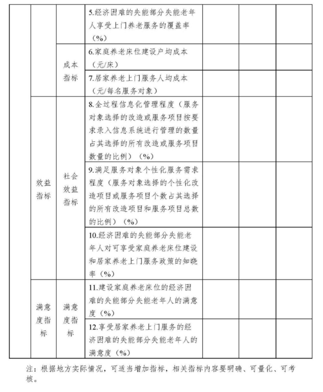 (二)支持范圍。項(xiàng)目資金用于項(xiàng)目地區(qū)為符合條件的老年人建設(shè)家庭養(yǎng)老床位和提供居家養(yǎng)老上門服務(wù)(實(shí)施標(biāo)準(zhǔn)見附件2)兩方面支出。對經(jīng)評估適宜建設(shè)家庭養(yǎng)老床位的老年人,為其建設(shè)家庭養(yǎng)老床位,并可根據(jù)其需求同時提供居家養(yǎng)老上門服務(wù);對未建設(shè)家庭養(yǎng)老床位但有居家養(yǎng)老上門服務(wù)需求的,提供居家養(yǎng)老上門服務(wù)。提供的居家養(yǎng)老上門服務(wù)須在項(xiàng)目周期內(nèi)為同一對象累計提供不少于30次。