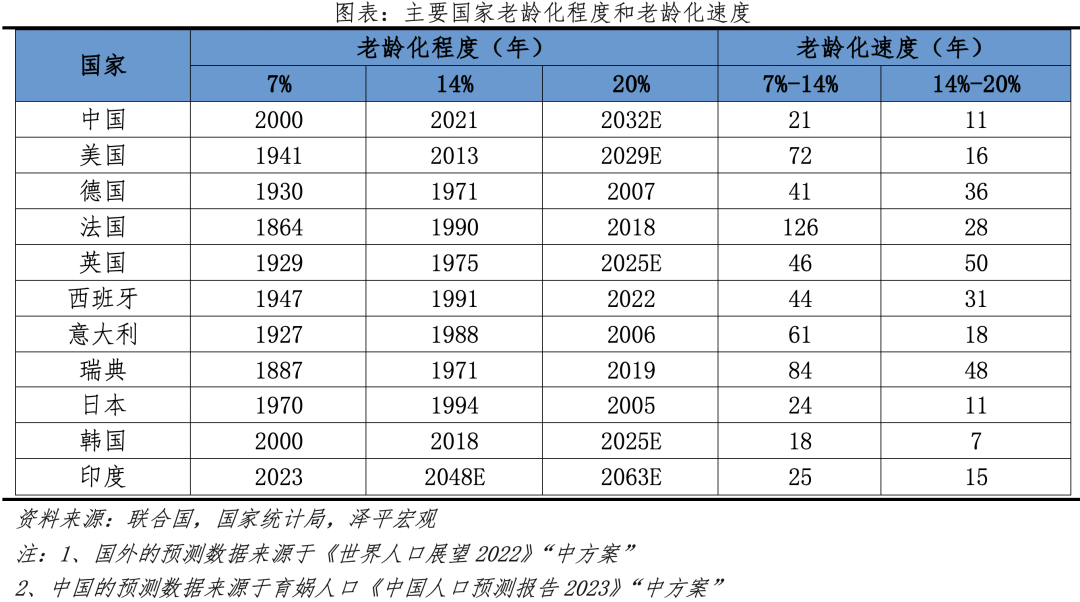 2)速度快,未來(lái)30多年處于老齡化快速深化期。我國(guó)老齡化速度不斷加快,2001-2010年中國(guó)65歲及以上老年人口占比年均增加0.2個(gè)百分點(diǎn),2011-2023年年均增加0.5個(gè)百分點(diǎn),人口老齡化速度明顯加快。隨著1962-1975年第二輪嬰兒潮出生人口逐漸衰老并進(jìn)入生命終點(diǎn),未來(lái)30多年中國(guó)人口老齡化程度將快速深化。國(guó)際對(duì)比看,從7%的老齡化到14%的深度老齡化,法國(guó)用了126年、英國(guó)46年、德國(guó)40年、日本24年、中國(guó)只用了21年;從7%的深度老齡化到20%的超級(jí)老齡化,法國(guó)用了28年、德國(guó)用了36年、日本用了11年,預(yù)計(jì)中國(guó)僅用10年左右。