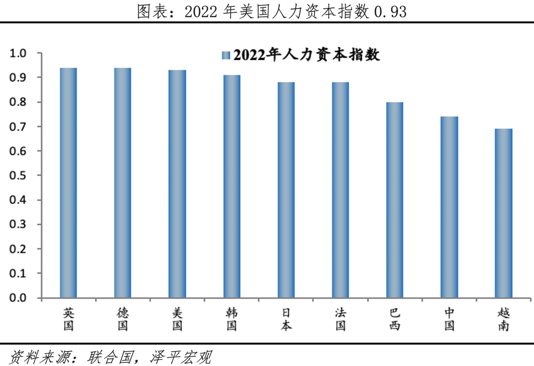 2)通過(guò)擴(kuò)大高等教育覆蓋范圍、提升高等教育質(zhì)量,美國(guó)不斷增強(qiáng)勞動(dòng)力素質(zhì),2020年美國(guó)人力資本指數(shù)0.7,處于世界前列。隨著嬰兒潮人口到達(dá)入學(xué)年齡,1972年與1976年《高等教育法》兩次修正,分別將私立學(xué)校與無(wú)高中文憑學(xué)生納入聯(lián)邦資助范圍;20世紀(jì)70年代,社區(qū)學(xué)院開(kāi)始降低入學(xué)要求,高等教育規(guī)模擴(kuò)大。20世紀(jì)80年代以來(lái),美國(guó)高等教育重心轉(zhuǎn)移至提升教育質(zhì)量。美國(guó)已經(jīng)有美國(guó)商學(xué)院認(rèn)證委員會(huì)(ACBSP)等近七十個(gè)專(zhuān)業(yè)評(píng)估機(jī)構(gòu),有高等教育委員會(huì)(HLC)等六個(gè)區(qū)域認(rèn)證機(jī)構(gòu),形成了多層次教育質(zhì)量保障體系。2022年美國(guó)人力資本指數(shù)0.93,處于世界前列,與英、德相近,顯著高于巴西、越南等發(fā)展中國(guó)家。