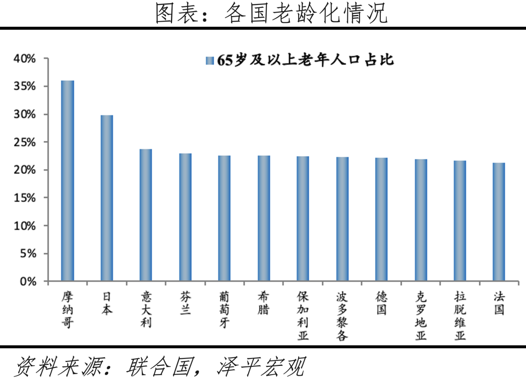 日本老齡化起步晚,但是老齡化速度較快,是老齡化程度最高的國(guó)家之一,2023年65歲及以上老人占比近30%,全球范圍僅小幅低于摩納哥。