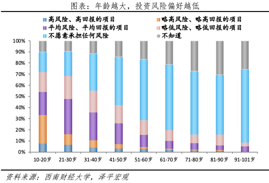 3)投資風(fēng)險(xiǎn)偏好下降,資產(chǎn)配置傾向保本保收益,投資活力下降。隨著人口年齡增加,個(gè)體對(duì)風(fēng)險(xiǎn)資產(chǎn)的需求呈現(xiàn)先高后低的變化。生命周期假說(shuō)認(rèn)為,在人的一生中儲(chǔ)蓄先增加再減少,隨著老齡化程度加深,社會(huì)總儲(chǔ)蓄率也將呈現(xiàn)先增后減的趨勢(shì)。在儲(chǔ)蓄積累期,對(duì)風(fēng)險(xiǎn)資產(chǎn)的需求增加;進(jìn)入儲(chǔ)蓄消耗期,整體投資將偏向保守,對(duì)風(fēng)險(xiǎn)資產(chǎn)的需求逐步下降。根據(jù)西南財(cái)經(jīng)大學(xué)家庭金融調(diào)查與研究中心2019年的“中國(guó)家庭金融調(diào)查”(CHIFS),40歲以下、40歲到60歲、60歲以上年齡段人口對(duì)高風(fēng)險(xiǎn)資產(chǎn)偏好比重分別為18%、6%、4%,隨著年齡增加,對(duì)高風(fēng)險(xiǎn)資產(chǎn)偏好逐漸下降。隨著老齡化程度加深,社會(huì)整體風(fēng)險(xiǎn)投資偏好也將下降,2011-2019年高風(fēng)險(xiǎn)投資偏好由6%下降至3%。