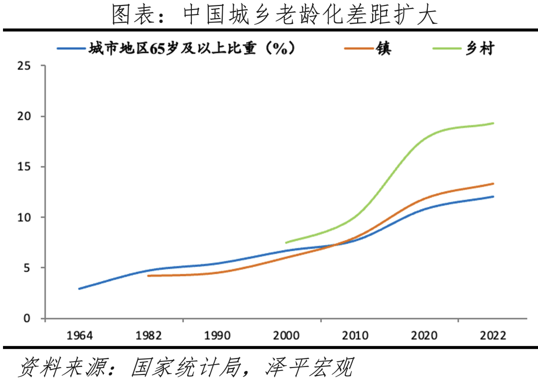 5)城鄉(xiāng)倒置、東高西低。分城鄉(xiāng)看,我國(guó)鄉(xiāng)村地區(qū)人口老齡化程度高于城鎮(zhèn),且差距不斷擴(kuò)大,老齡化“城鄉(xiāng)倒置”明顯。2010-2022年城市、鎮(zhèn)和鄉(xiāng)村老年人口占比分別由7.7%、8.9%、10.1%增至12.0%、13.3%、19.3%。分省看,2022年我國(guó)31個(gè)省級(jí)及以上行政單位(不含港澳臺(tái))中,有20個(gè)進(jìn)入深度老齡化,遼寧、上海、重慶老齡化程度最高,老年人口占比分別為20%、18.7%、18.3%。西藏、新疆和廣東是最“年輕”的省級(jí)及以上單位,老年人口占比分別為5.9%、8.4%、9.6%。