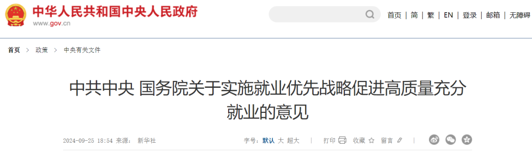 9月25日,《中共中央 國(guó)務(wù)院關(guān)于實(shí)施就業(yè)優(yōu)先戰(zhàn)略促進(jìn)高質(zhì)量充分就業(yè)的意見》發(fā)布,部署24條舉措,持續(xù)促進(jìn)就業(yè)質(zhì)的有效提升和量的合理增長(zhǎng)。其中關(guān)于康養(yǎng)產(chǎn)業(yè)吸納就業(yè),提到“開辟康養(yǎng)就業(yè)新領(lǐng)域”;關(guān)于老年人就業(yè),提到“創(chuàng)造適合老年人的多樣化、個(gè)性化就業(yè)崗位”。