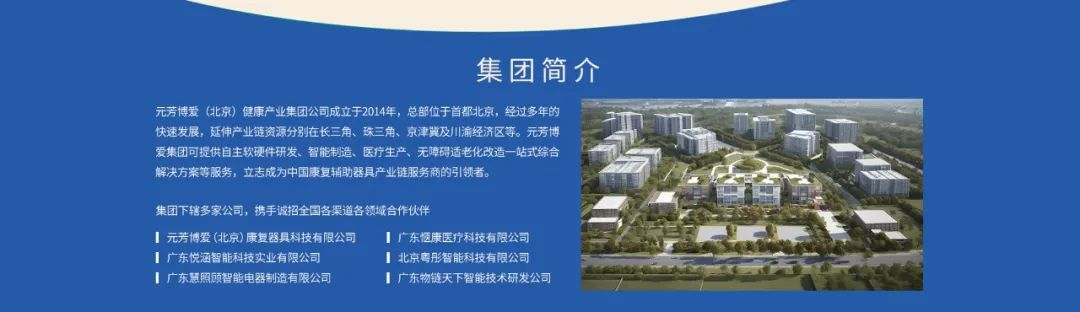 元芳博愛集團總部坐落于北京,在大灣區(qū)有多家全資控股子公司,是國內(nèi)專業(yè)提供智能制造、智能物聯(lián)、醫(yī)療制造、高科技服務(wù)等業(yè)務(wù)的集團公司。此外,公司還提供全生命周期康復(fù)輔具整體解決方案、無障礙適老化改造整體解決方案、家庭智慧養(yǎng)老整體解決方案、家庭養(yǎng)老床位建設(shè)等服務(wù)。