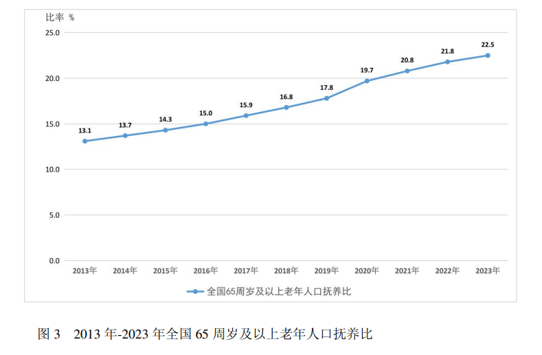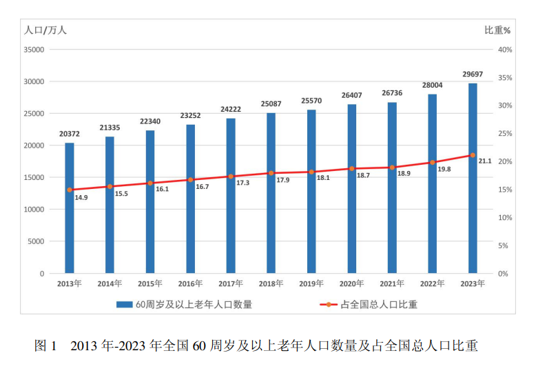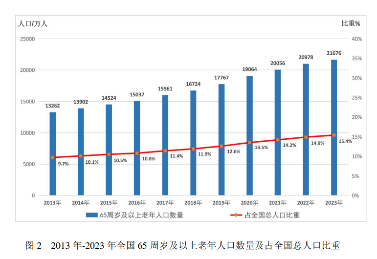 截至 2023 年末,全國 60 周歲及以上老年人口 29697 萬人,占總?cè)丝诘?21.1%;全國 65 周歲及以上老年人口 21676 萬人,占總?cè)丝诘?15.4%。全國 65 周歲及以上老年人口撫養(yǎng)比 22.5%.