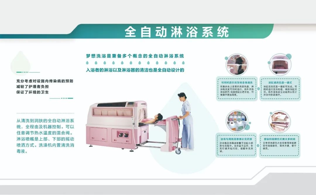 從清洗到潤(rùn)膚的全自動(dòng)淋浴系統(tǒng),全程由及機(jī)器控制??梢匀我庹{(diào)節(jié)熱水溫度的混合閥。淋浴噴嘴是上部、下部的搖動(dòng)噴灑方式。洗澡機(jī)內(nèi)置清洗消毒液。