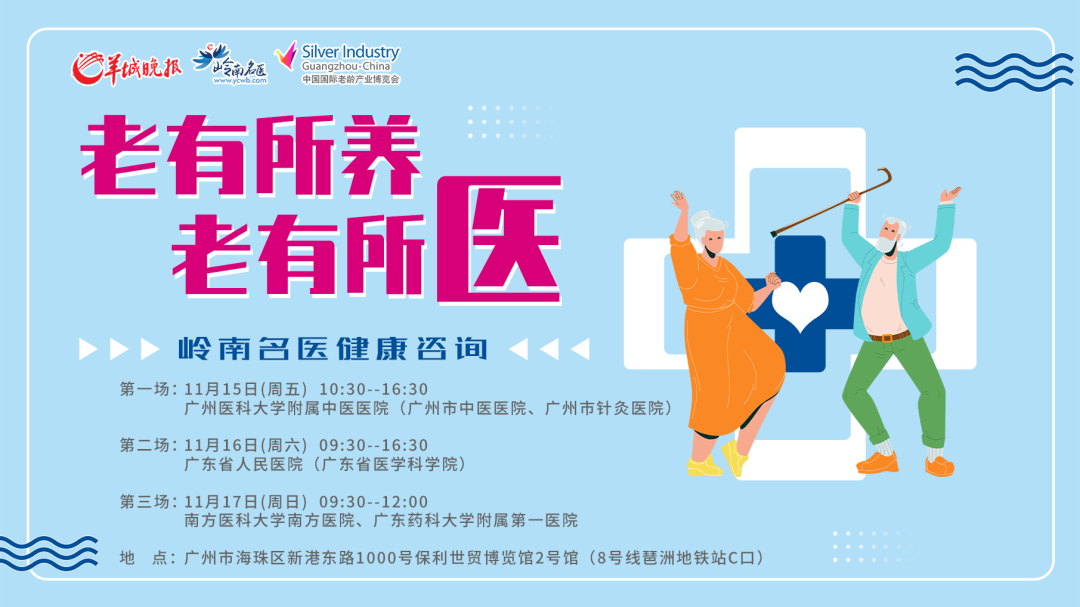 身體有些“小毛病”,但又約不到名專家?專屬老年人的健康福利來啦!為了關(guān)注老年人的身心健康,滿足老年人的美好生活需要,11月15日-17日,羊城晚報(bào)將攜手廣州醫(yī)科大學(xué)附屬中醫(yī)醫(yī)院(廣州市中醫(yī)醫(yī)院、廣州市針灸醫(yī)院)、廣東省人民醫(yī)院(廣東省醫(yī)學(xué)科學(xué)院)、南方醫(yī)科大學(xué)南方醫(yī)院、廣東藥科大學(xué)附屬第一醫(yī)院的名醫(yī)專家,在老博會(huì)現(xiàn)場(chǎng)設(shè)立“老有所養(yǎng) 老有所醫(yī)”——嶺南名醫(yī)健康咨詢區(qū),為市民群眾的健康排憂解難。
