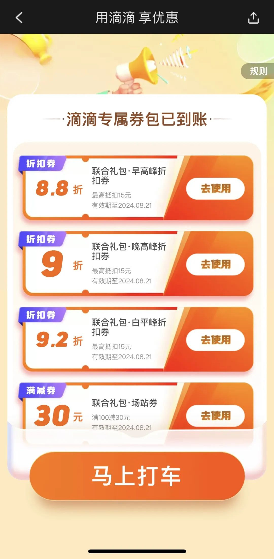 9折晚高峰打車折扣券*1