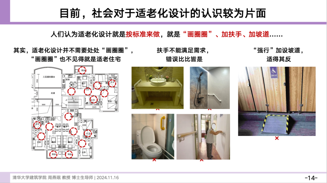針對(duì)目前對(duì)適老化設(shè)計(jì)的片面認(rèn)識(shí),周燕珉用大量的時(shí)間案例圖片和視頻,深入淺出地向與會(huì)嘉賓解讀適老化改造的7項(xiàng)基本設(shè)計(jì)理念: