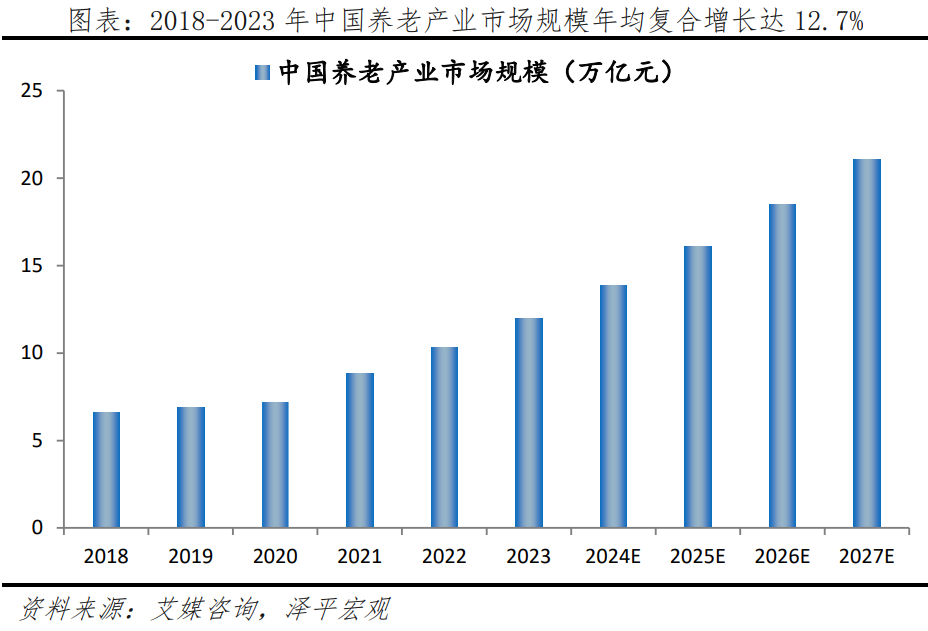 隨著人口老齡化時(shí)代到來(lái),為滿足中老年人群體在衣、食、住、行、醫(yī)等方面需求,銀發(fā)經(jīng)濟(jì)市場(chǎng)潛力巨大,預(yù)計(jì)到2050年,老年人口消費(fèi)總量將占中國(guó)GDP的21%。新一代中老年人群教育水平普遍較高,他們?cè)谕诵莺蟾匾暽钯|(zhì)量和社交活動(dòng),愿意為自己興趣和愛好買單,這為銀發(fā)經(jīng)濟(jì)市場(chǎng)蓬勃發(fā)展提供堅(jiān)實(shí)基礎(chǔ)。據(jù)艾媒咨詢、中國(guó)老齡科學(xué)研究中心數(shù)據(jù),2018-2023年,中國(guó)養(yǎng)老產(chǎn)業(yè)市場(chǎng)規(guī)模年均復(fù)合增長(zhǎng)率達(dá)12.7%,預(yù)計(jì)2050年老年人口消費(fèi)總量為40萬(wàn)-69萬(wàn)億元,占全國(guó)GDP的20.7%。