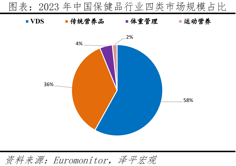 膳食補(bǔ)充劑占保健品市場(chǎng)主導(dǎo)地位,中老年人更偏好鈣片、奶粉、維生素和葉黃素等產(chǎn)品。保健品市場(chǎng)主要分為維生素和膳食補(bǔ)充劑(VDS)、運(yùn)動(dòng)營(yíng)養(yǎng)品、體重管理和傳統(tǒng)滋補(bǔ)四大類。根據(jù)Euromonitor數(shù)據(jù),2023 年VDS 市場(chǎng)規(guī)模占中國(guó)保健品行業(yè)近60%,消費(fèi)者主要出于日常增強(qiáng)免疫力的需求選擇VDS產(chǎn)品。其中,鈣片、奶粉、魚油、維生素、葉黃素等品類尤其受到中老年人的歡迎。例如,隨著年齡增長(zhǎng),老年人對(duì)營(yíng)養(yǎng)的需求變化,專為老年人設(shè)計(jì)的高鈣奶粉、富含多種維生素和礦物質(zhì)的營(yíng)養(yǎng)麥片、深海魚油等保健食品,有助于補(bǔ)充所需營(yíng)養(yǎng),維持身體健康。對(duì)于患有慢性疾病或身體虛弱的老年人,膳食補(bǔ)充劑如維生素D、益生菌等,可以幫助他們更好地?cái)z取營(yíng)養(yǎng),增強(qiáng)免疫力。從市占率看,根據(jù)Euromonitor數(shù)據(jù),2023年湯臣倍健在VDS市場(chǎng)的市占率為10.4%,穩(wěn)居行業(yè)龍頭,其次是安利與健合集團(tuán),前十企業(yè)市場(chǎng)集中度低于40%,我國(guó)保健品市場(chǎng)仍具有較大的整合和發(fā)展空間。(膳食補(bǔ)充劑是含有維生素、礦物質(zhì)、草藥或其它植物產(chǎn)品或氨基酸的產(chǎn)品(除煙草之外)。)