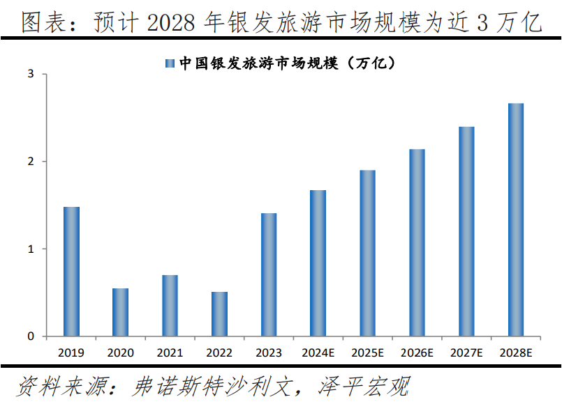 展望未來(lái),隨著60、70后“黃金一代”逐漸步入老齡化,中高端旅游產(chǎn)品將迎來(lái)更多發(fā)展機(jī)遇,旅游服務(wù)重要性愈發(fā)凸顯,預(yù)計(jì)2028年,銀發(fā)旅游市場(chǎng)規(guī)模將達(dá)約2.7萬(wàn)億元,2024-2028年年均復(fù)合增速將達(dá)12.4%。