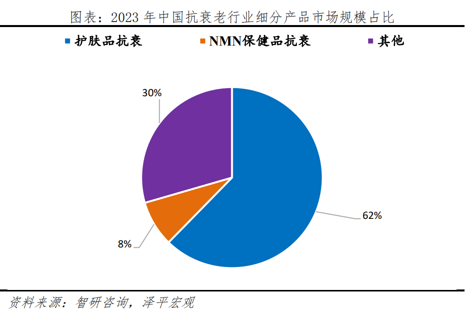 抗衰領(lǐng)域,隨著生活方式和化妝習(xí)慣變化,銀發(fā)族對(duì)永葆青春渴望推動(dòng)抗衰老產(chǎn)品銷售增長(zhǎng),預(yù)計(jì)2024年中國(guó)抗衰市場(chǎng)規(guī)模達(dá)1500億元。2024年1月,國(guó)務(wù)院發(fā)布的《關(guān)于發(fā)展銀發(fā)經(jīng)濟(jì)增進(jìn)老年人福祉的意見》中強(qiáng)調(diào):“發(fā)展抗衰老產(chǎn)業(yè),推動(dòng)生物技術(shù)與延緩老年病深度融合,開發(fā)老年病早期篩查產(chǎn)品和服務(wù)。”當(dāng)前,消費(fèi)者對(duì)抗衰老護(hù)膚品的需求日益多元化,市場(chǎng)消費(fèi)熱情持續(xù)高漲。根據(jù)智研咨詢數(shù)據(jù),2023年中國(guó)抗衰老行業(yè)市場(chǎng)規(guī)模約為1522億元,其中,護(hù)膚品抗衰老、NMN保健品抗衰、其他抗衰產(chǎn)品占比分別為62%、30%、8%。隨著抗衰老護(hù)膚品和保健品成分的迭代升級(jí),越來(lái)越多消費(fèi)者認(rèn)可抗衰成分的有效性,并通過(guò)使用護(hù)膚品和保健品進(jìn)行抗衰老。根據(jù)艾媒咨詢數(shù)據(jù),目前,68.2%的消費(fèi)者通過(guò)健身進(jìn)行抗衰老,62.4%的消費(fèi)者使用護(hù)膚品,近五成的消費(fèi)者注重飲食和服用保健品。