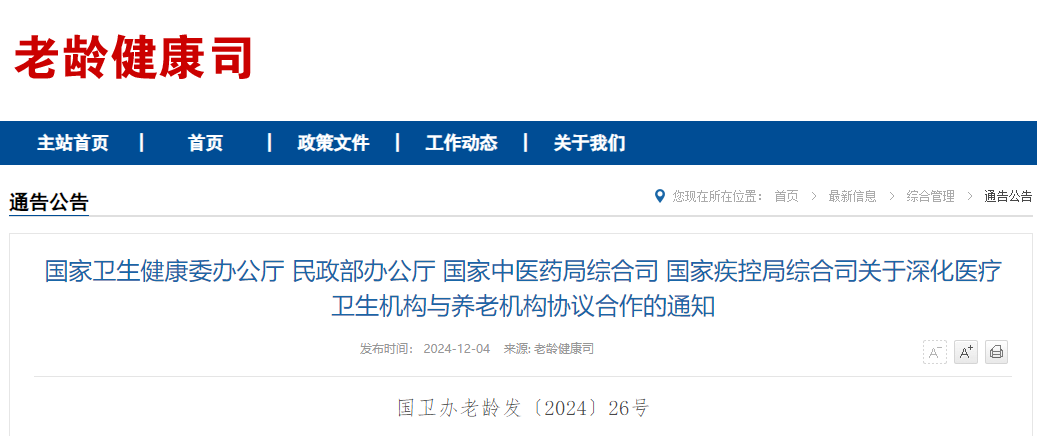 為深入貫徹落實(shí)黨中央、國(guó)務(wù)院決策部署和黨的二十屆三中全會(huì)精神,促進(jìn)醫(yī)養(yǎng)結(jié)合發(fā)展,深化醫(yī)療衛(wèi)生機(jī)構(gòu)與養(yǎng)老機(jī)構(gòu)協(xié)議合作,加強(qiáng)服務(wù)供需對(duì)接,為老年人提供優(yōu)質(zhì)、高效、可及的醫(yī)養(yǎng)結(jié)合服務(wù),國(guó)家衛(wèi)生健康委聯(lián)合相關(guān)部門印發(fā)《通知》,并制定了《醫(yī)療衛(wèi)生機(jī)構(gòu)與養(yǎng)老機(jī)構(gòu)協(xié)議合作文本(參考)》。