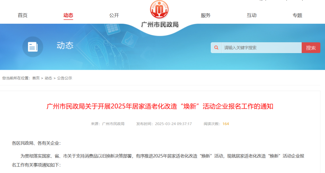 為貫徹落實(shí)國家、省、市關(guān)于支持消費(fèi)品以舊換新決策部署,有序推進(jìn)2025年居家適老化改造“煥新”活動(dòng),廣州市民政局向社會(huì)廣泛征集居家適老化改造“煥新”活動(dòng)企業(yè),一起來看看怎么報(bào)名吧!