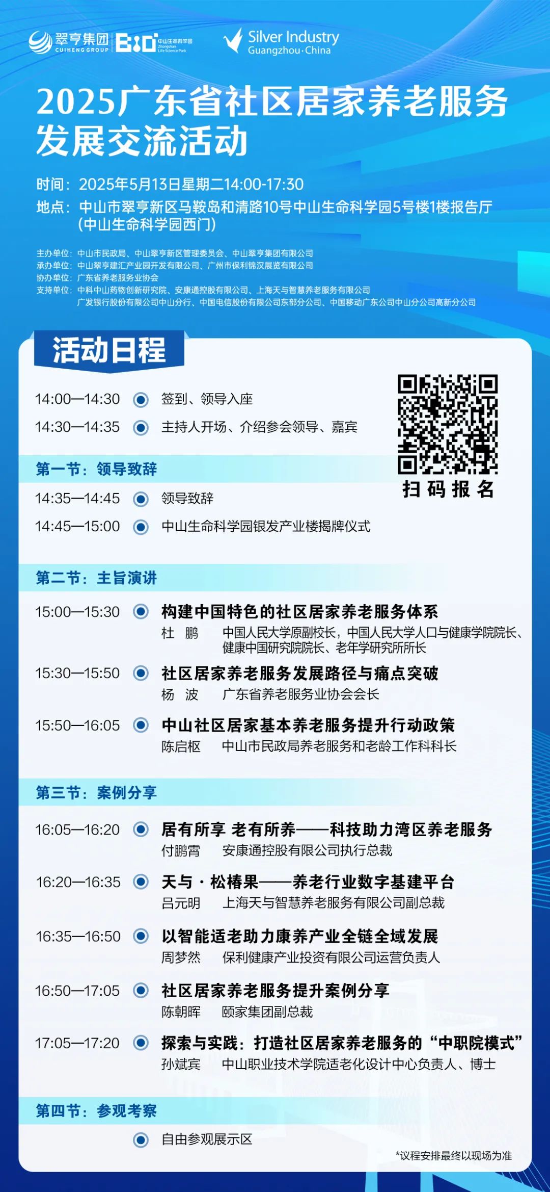5月13日,由中山市民政局、中山翠亨新區(qū)管理委員會(huì)、中山翠亨集團(tuán)有限公司主辦,中山翠亨建匯產(chǎn)業(yè)園開發(fā)有限公司與廣州市保利錦漢展覽有限公司承辦的“2025廣東省社區(qū)居家養(yǎng)老服務(wù)發(fā)展交流活動(dòng)”將在中山生命科學(xué)園舉辦。