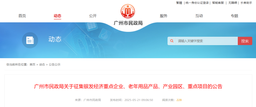 為落實(shí)國(guó)家、省、市關(guān)于銀發(fā)經(jīng)濟(jì)的決策部署,加快推進(jìn)廣州市銀發(fā)經(jīng)濟(jì)高質(zhì)量發(fā)展,根據(jù)《廣東省人民政府辦公廳關(guān)于印發(fā)廣東省促進(jìn)銀發(fā)經(jīng)濟(jì)高質(zhì)量發(fā)展增進(jìn)老年人福祉實(shí)施方案的通知》(粵府辦〔2025〕4號(hào))、《廣州市民政局 廣州市發(fā)展改革委關(guān)于印發(fā)廣州市促進(jìn)銀發(fā)經(jīng)濟(jì)高質(zhì)量發(fā)展若干措施的通知》(穗民〔2024〕110號(hào)),我局擬建立全市銀發(fā)經(jīng)濟(jì)重點(diǎn)企業(yè)、產(chǎn)品、產(chǎn)業(yè)園區(qū)、重點(diǎn)項(xiàng)目清單,面向符合條件的市場(chǎng)主體征集銀發(fā)經(jīng)濟(jì)重點(diǎn)企業(yè)、老年用品產(chǎn)品、產(chǎn)業(yè)園區(qū)、重點(diǎn)項(xiàng)目,現(xiàn)就有關(guān)事項(xiàng)公告如下: