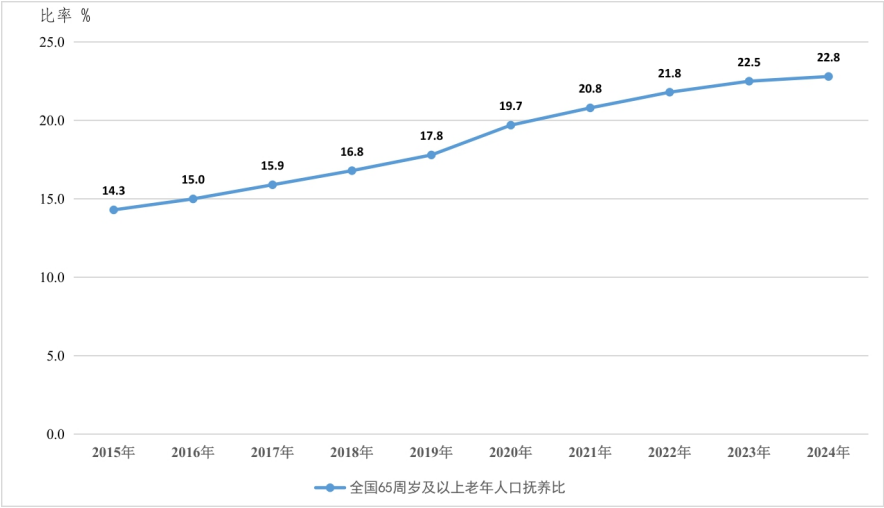 圖3 2015—2024年全國(guó)65周歲及以上老年人口撫養(yǎng)比(圖1—3數(shù)據(jù)來(lái)源:國(guó)家統(tǒng)計(jì)局)