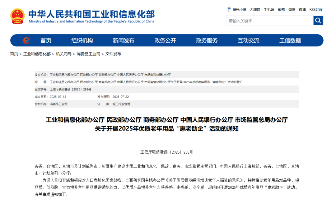 今年7月,國家工信部、民政部等五部門聯(lián)合發(fā)布了《關(guān)于開展2025年優(yōu)質(zhì)老年用品“惠老助企”活動的通知》。重點圍繞老年用品創(chuàng)新、升級、推廣展開,積極推動老年用品增品種、提品質(zhì)、創(chuàng)品牌。