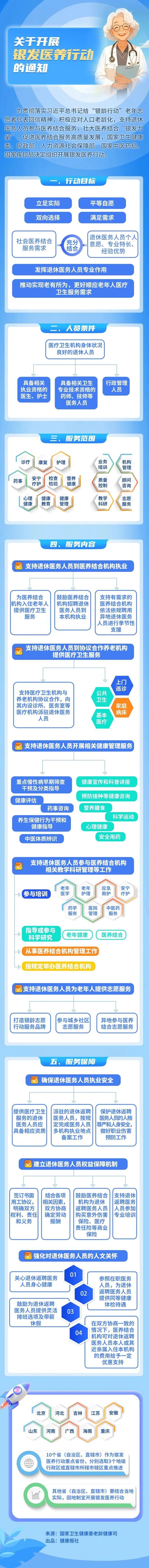 為貫徹落實(shí)習(xí)近平總書記給“銀齡行動(dòng)”老年志愿者代表回信精神,積極應(yīng)對(duì)人口老齡化,支持退休醫(yī)務(wù)人員參與醫(yī)養(yǎng)結(jié)合服務(wù),壯大醫(yī)養(yǎng)結(jié)合“銀發(fā)力量”,促進(jìn)醫(yī)養(yǎng)結(jié)合服務(wù)高質(zhì)量發(fā)展,國(guó)家衛(wèi)生健康委、民政部、人力資源社會(huì)保障部、國(guó)家中醫(yī)藥局、國(guó)家疾控局決定組織開展銀發(fā)醫(yī)養(yǎng)行動(dòng)。現(xiàn)就有關(guān)事項(xiàng)通知如下: