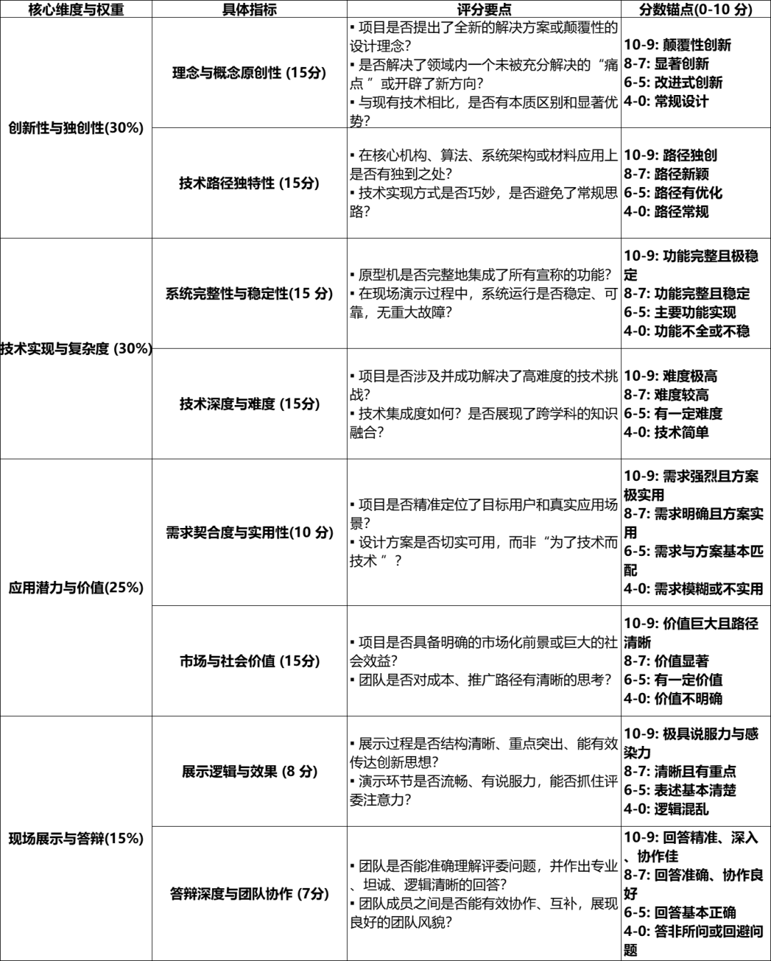 評(píng)委獨(dú)立打分:每位評(píng)委根據(jù)上述體系,為每個(gè)項(xiàng)目的每個(gè)具體指標(biāo)獨(dú)立打分(0-10 分)。
