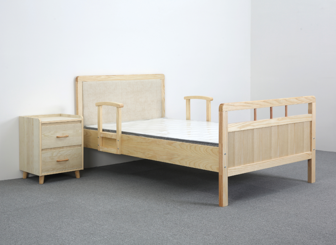 產(chǎn)品實(shí)木床頭架鋼制床架,讓使用者有家的溫馨感,從細(xì)節(jié)上面,保障了老人安全,造型上避免棱角分明的元素,采用圓形等曲線造型,以防止磕碰等情況的發(fā)生,給老年人足夠的安全感。