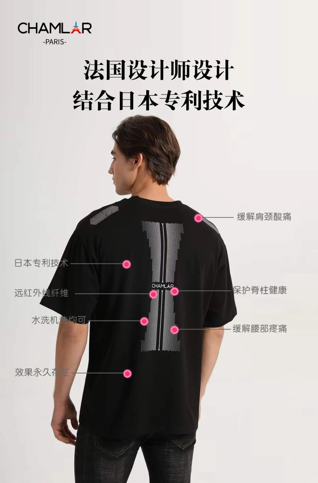 Chamlar®健康T恤由專利原材料精加工制成,通過釋放大量的遠紅外線能夠促進血液循環(huán)、舒緩自律神經,是一種增進健康、美觀大方的健康T恤衫。在睡眠或放松時間穿著,可以調整自律神經的平衡,提升休息和睡眠質量。如果您難以入睡、夜間易醒、起床困難、白天容易困倦、體溫偏低,那您一定要試試Chamlar健康T恤!