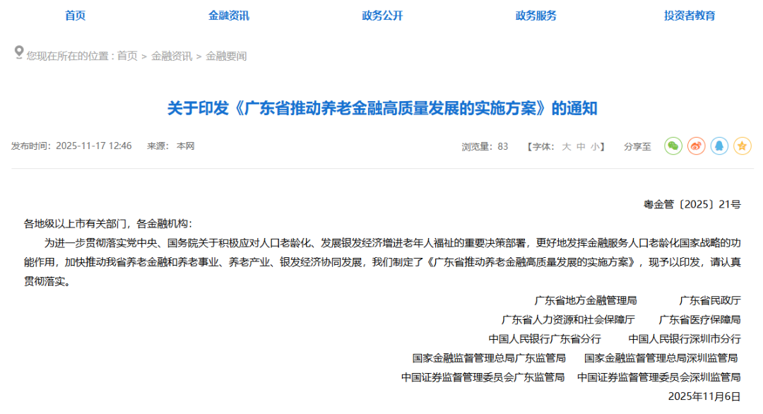 11月17日,廣東省地方金融管理局發(fā)布《廣東省推動養(yǎng)老金融高質(zhì)量發(fā)展的實施方案》(下稱《實施方案》)。《實施方案》由省地方金融管理局會同省民政廳、省人力資源和社會保障廳、省醫(yī)療保障局、人民銀行廣東省分行、人民銀行深圳市分行、廣東金融監(jiān)管局、深圳金融監(jiān)管局、廣東證監(jiān)局、深圳證監(jiān)局等多部門聯(lián)合印發(fā),是廣東首次出臺養(yǎng)老金融專屬政策。