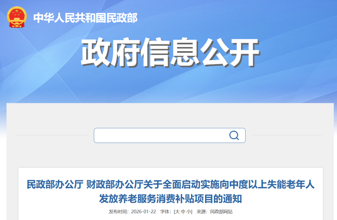 根據(jù)《民政部 財政部關(guān)于實施向中度以上失能老年人發(fā)放養(yǎng)老服務(wù)消費補貼項目的通知》(民發(fā)〔2025〕37號)部署,經(jīng)研究決定,從2026年1月1日起,在全國范圍內(nèi)組織實施向中度以上失能老年人發(fā)放養(yǎng)老服務(wù)消費補貼項目(以下簡稱補貼項目),現(xiàn)就有關(guān)事項通知如下: