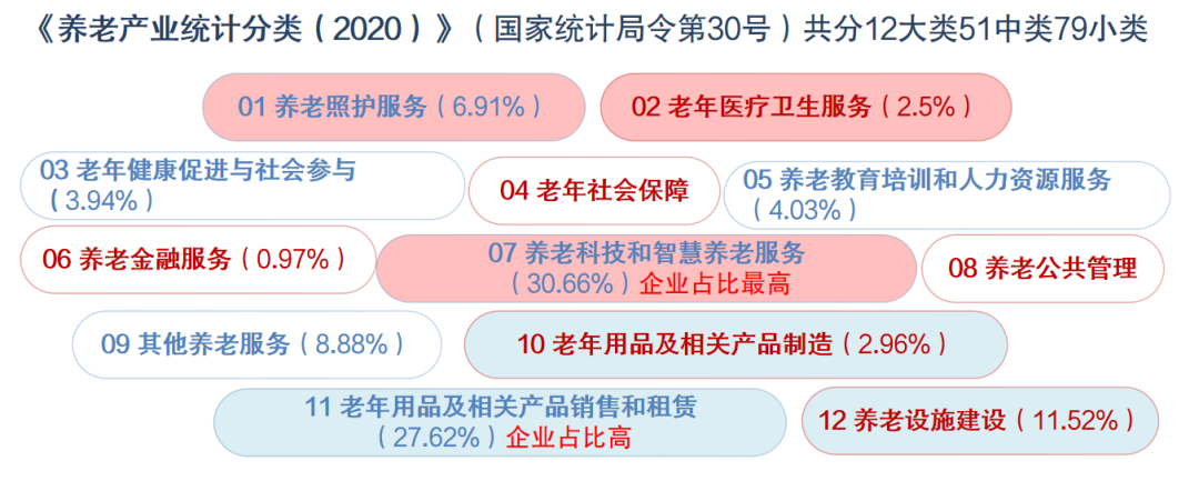 根據(jù)《養(yǎng)老產(chǎn)業(yè)統(tǒng)計(jì)分類(2020)》(國家統(tǒng)計(jì)局令第30號),養(yǎng)老產(chǎn)業(yè)共劃分為12個(gè)大類、51個(gè)中類、79個(gè)小類,基本覆蓋老年人從生活照護(hù)到產(chǎn)品供給、從公共服務(wù)到市場化服務(wù)的全生命周期需求。