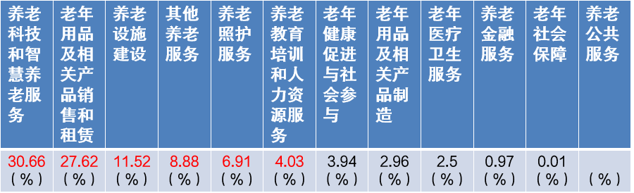養(yǎng)老科技和智慧養(yǎng)老服務(wù)領(lǐng)跑,占比超30%,成為政策與市場共同聚焦的重點(diǎn)方向;老年用品銷售與租賃領(lǐng)域占比近3成,緊密對接老齡群體日常需求,市場活躍度較高;養(yǎng)老設(shè)施建設(shè)等硬件投入穩(wěn)步推進(jìn),為各類服務(wù)提供基礎(chǔ)承載空間。